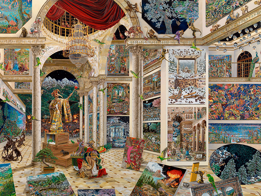 Raqib Shaw’s paintings are defined by an innovative and distinctive technique of drawing enamel with porcupine quills, through which he constructs intricately layered compositions that move between meditative calm and dynamic intensity.