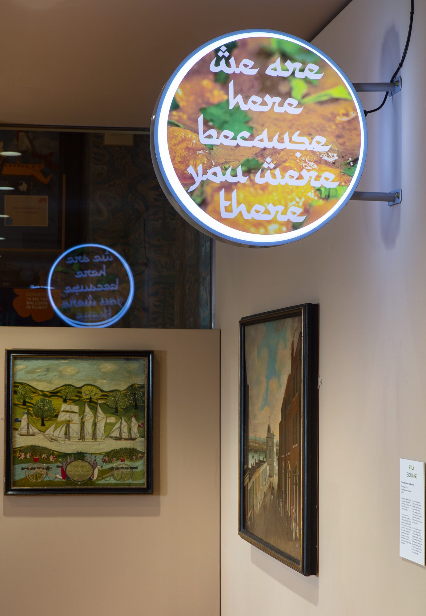 We Are Here Because You Were There (2022-24) is an art work in the form of a lightbox restaurant sign by artist Faisal Hussain (b. 1977).