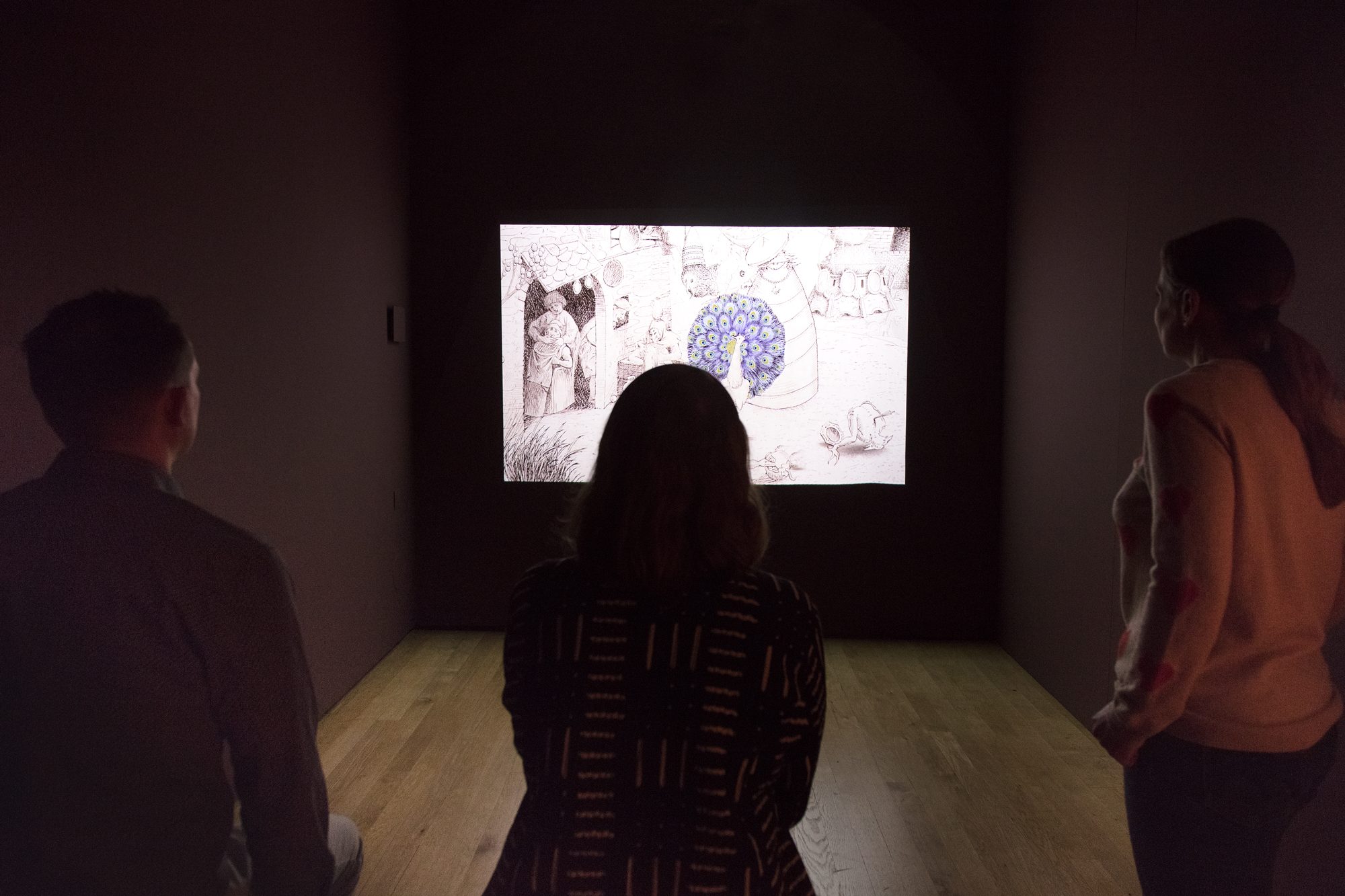 - There is an 18 minute animation playing on a continuous loop in a secluded space, with an ambient soundtrack. The space is dark and there is one bench available to sit on. Please be aware that there are brief depictions of sex and violence at points during the film.